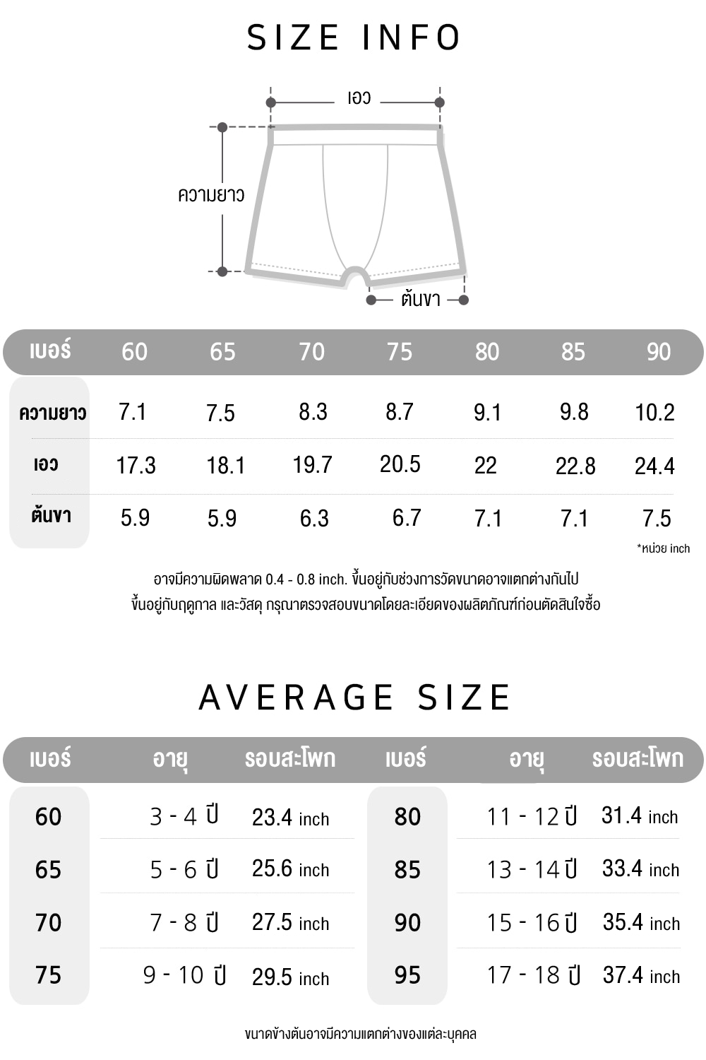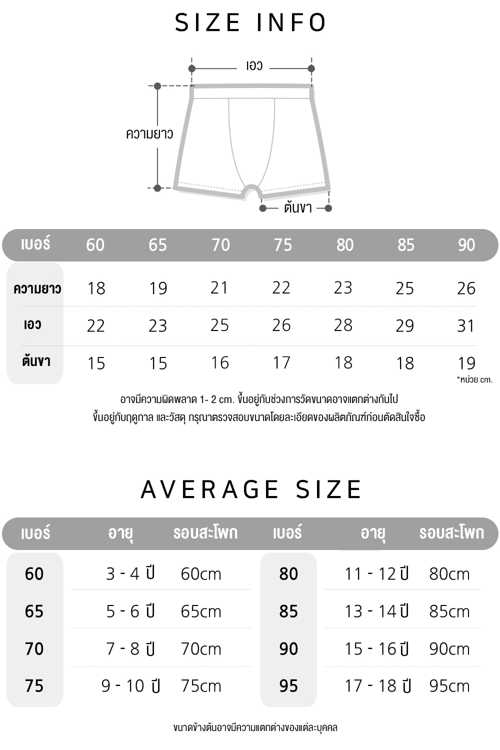 | ขนาด | 70 ( 7 – 8 ขวบ ), 75 ( 9 – 10 ขวบ ), 80 ( 11 – 12 ขวบ ), 85 ( 13 – 14 ขวบ ), 90 ( 15 – 16 ขวบ ) |