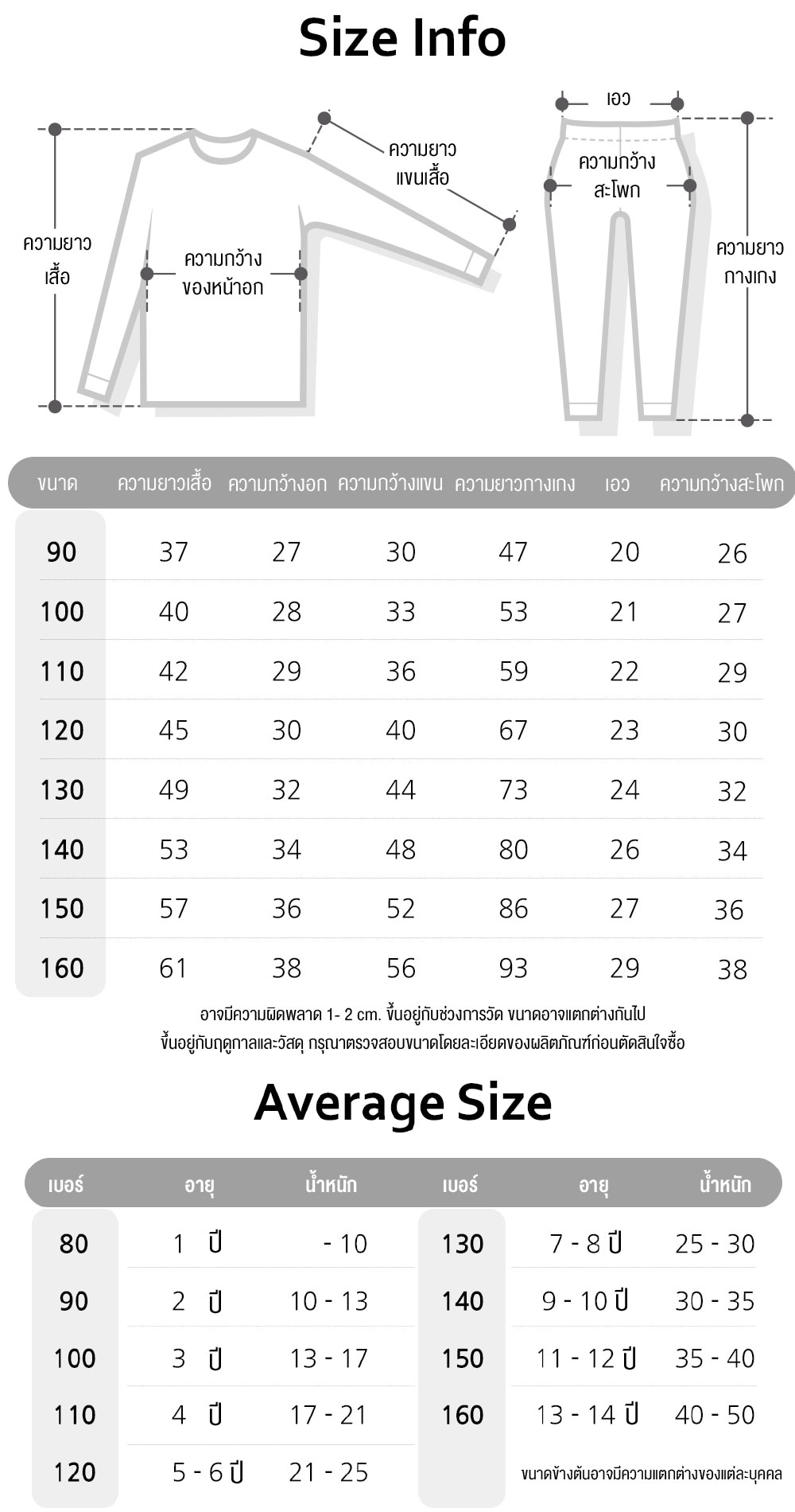 | ขนาด | 90 ( 2 ขวบ ), 100 ( 3 ขวบ ), 110 ( 4 ขวบ ), 120 ( 5 – 6 ขวบ ), 130 ( 7- 8 ขวบ ), 140 ( 9 – 10 ขวบ ), 150 (11-12 ขวบ), 160 (13-14 ขวบ) |