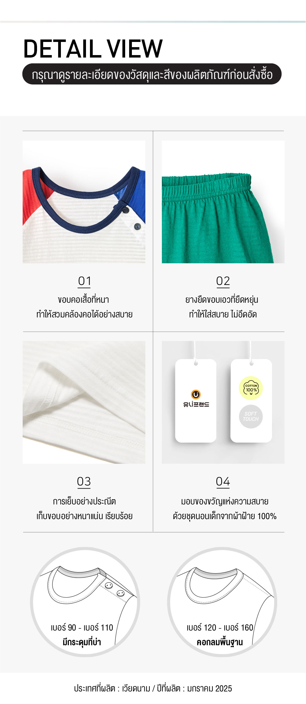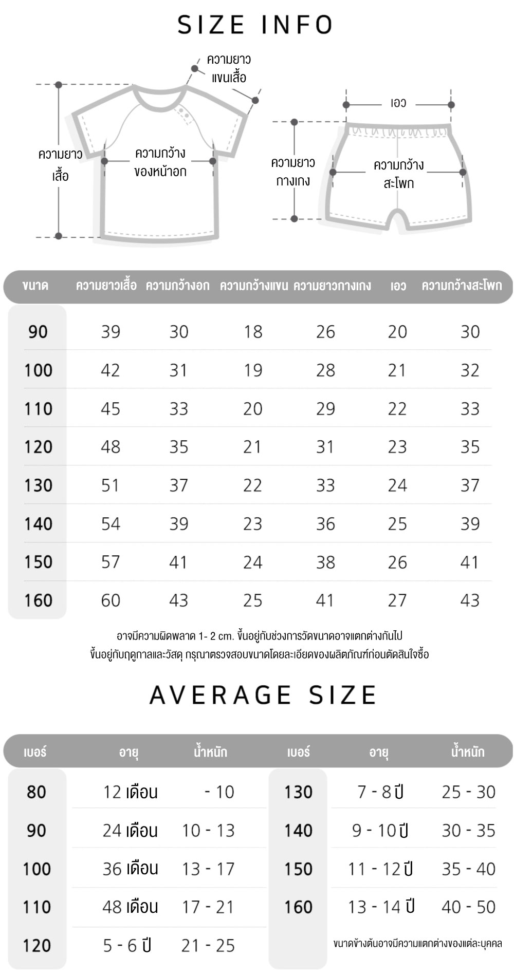 | ขนาด | 90 ( 2 ขวบ ), 100 ( 3 ขวบ ), 110 ( 4 ขวบ ), 120 ( 5 – 6 ขวบ ), 130 ( 7- 8 ขวบ ), 140 ( 9 – 10 ขวบ ), 150 (11-12 ขวบ), 160 (13-14 ขวบ) |