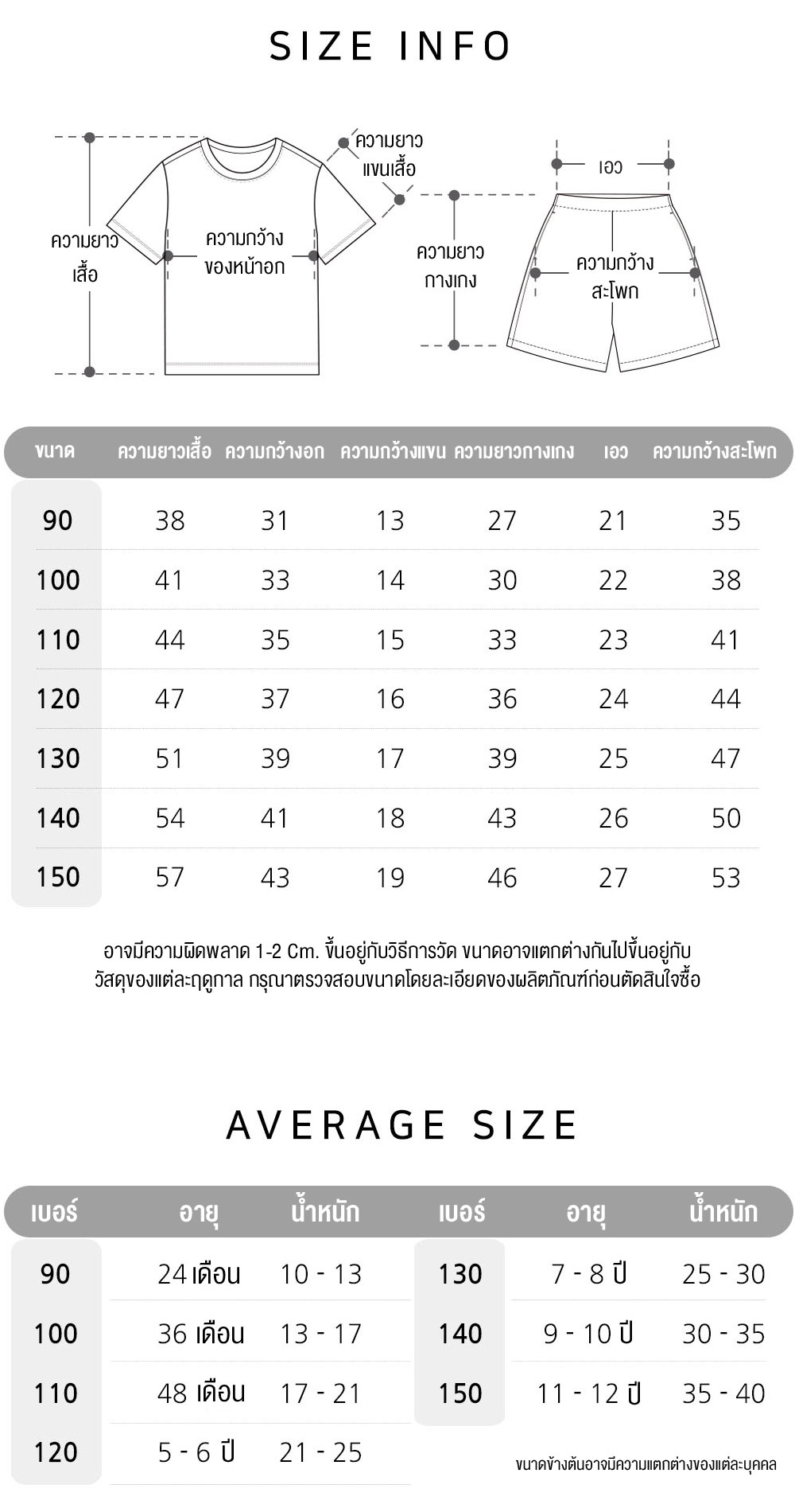 | ขนาด | 90 ( 2 ขวบ ), 100 ( 3 ขวบ ), 110 ( 4 ขวบ ), 120 ( 5 – 6 ขวบ ), 130 ( 7- 8 ขวบ ), 140 ( 9 – 10 ขวบ ), 150 (11-12 ขวบ) |