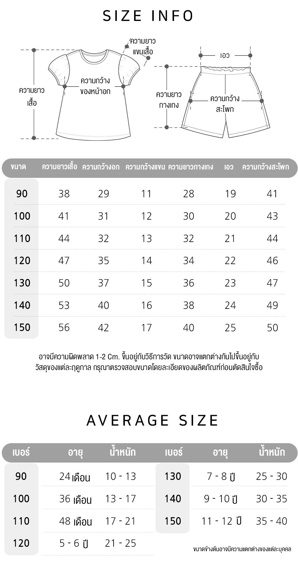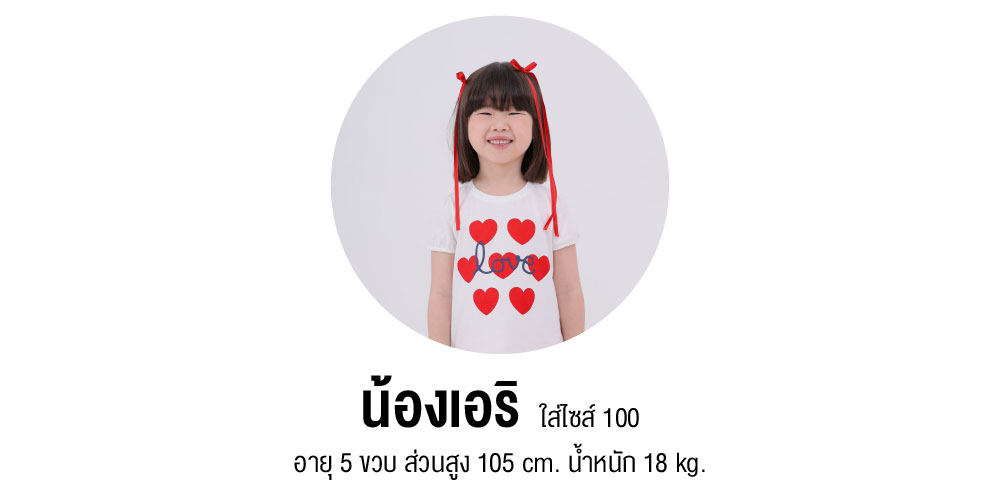 | ขนาด | 90 ( 2 ขวบ ), 100 ( 3 ขวบ ), 110 ( 4 ขวบ ), 120 ( 5 – 6 ขวบ ), 130 ( 7- 8 ขวบ ), 140 ( 9 – 10 ขวบ ), 150 (11-12 ขวบ) |